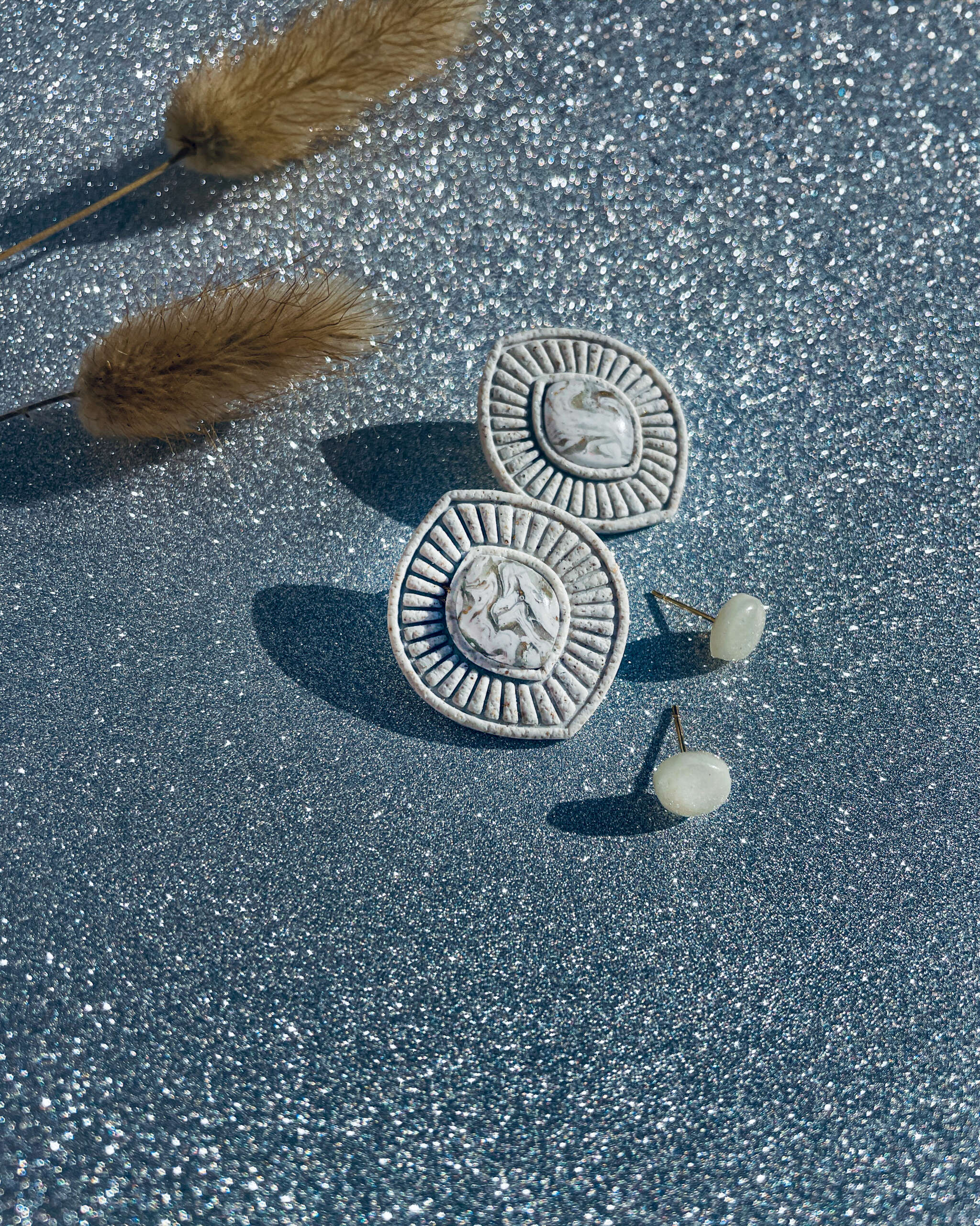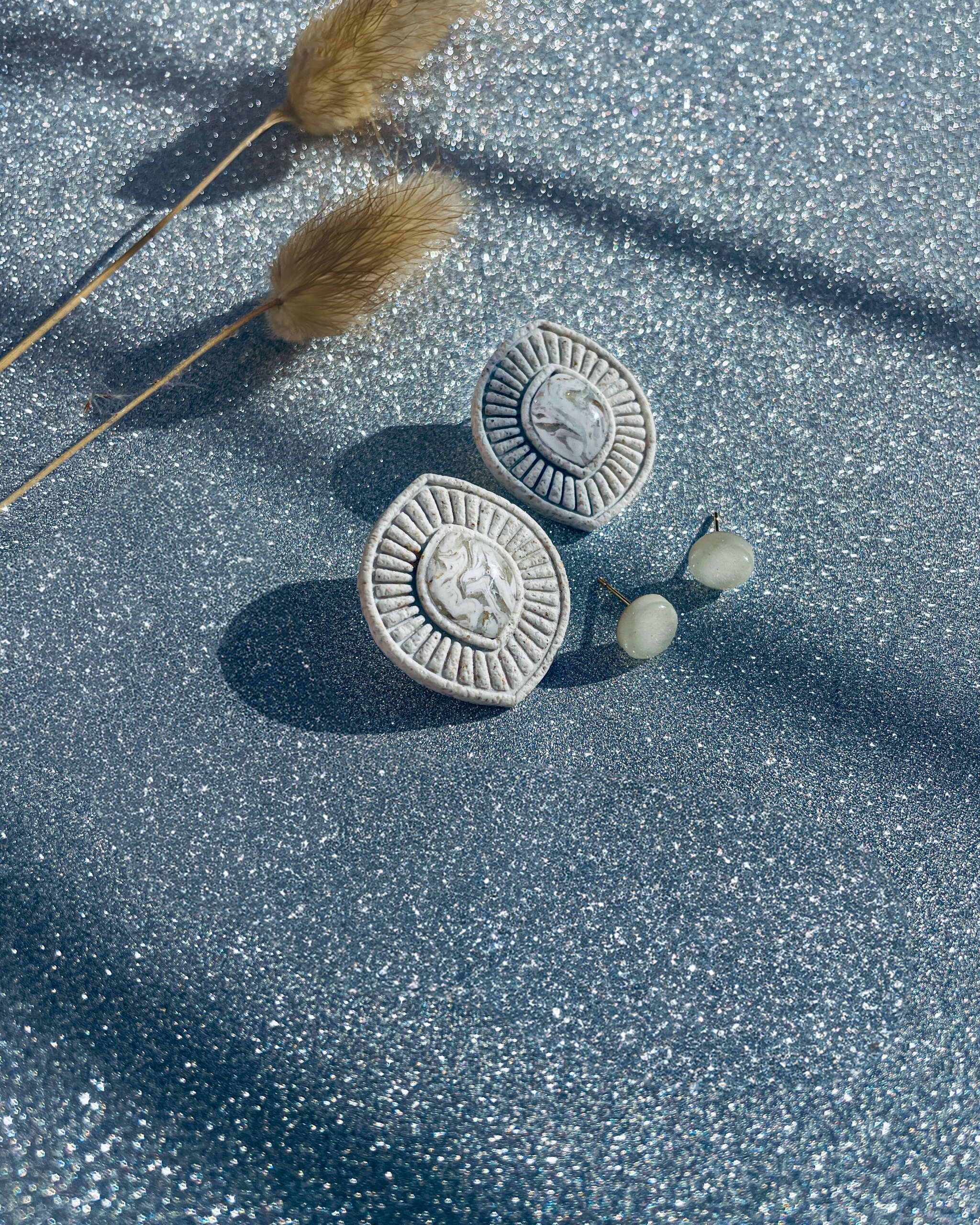 Handcrafted with radical artistry using Polymer Clay, each pair is sealed with UV Resin and adorned with 24K Gold Plated, 304 Stainless Steel Blank Studs.